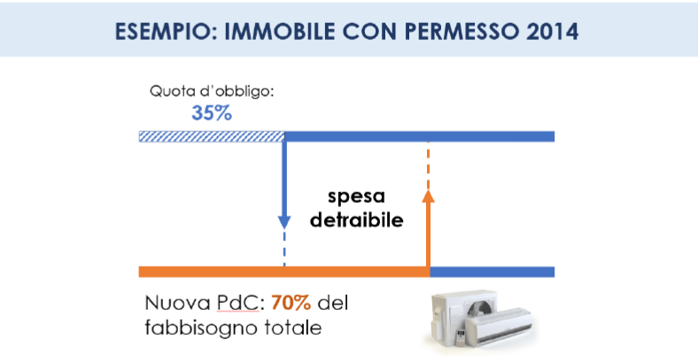 Oggi viene sostituita la pompa di calore con una nuova pompa di calore in grado di coprire il 70% del fabbisogno di energia termica. Semplificando, possiamo dire che metà della spesa è imputabile alla quota obbligatoria, l’altra metà è la quota eccedente l’obbligo e, di conseguenza, detraibile.