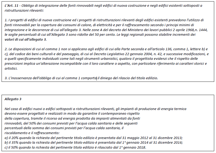 Oramai più di 10 anni fa, con il D. Lgs. 28/2011 ed in particolare all’articolo 11 e nell’allegato 3, è stato introdotto l’obbligo delle quote FER specificando che nel caso di nuovi edifici o edifici sottoposti a ristrutturazioni rilevanti, gli impianti di produzione di energia termica devono essere progettati e realizzati per garantire una specifica percentuale di copertura tramite l’utilizzo di fonti rinnovabili: